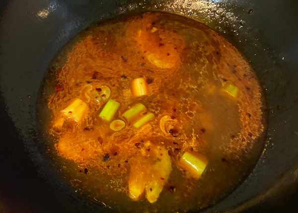 鍋裡倒油,燒熱以後澆在小蔥上面,呲啦呲啦的響聲,激發出瞭蔥花的香味。