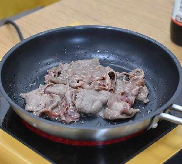 第4步、炒鍋加熱,倒少許油,加熱至4、5成熱時,將肥牛片入鍋中,用筷子迅速劃散。