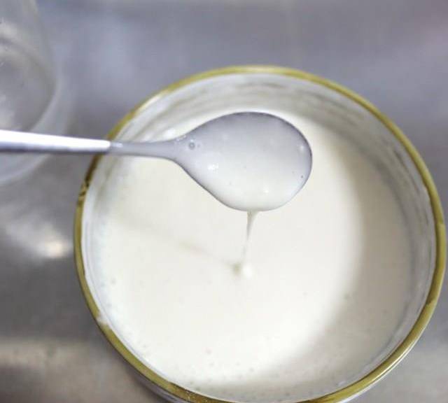 第2步、面粉中逐量倒入涼水,用勺子混合成稀糊狀,舀起來能快速垂落。