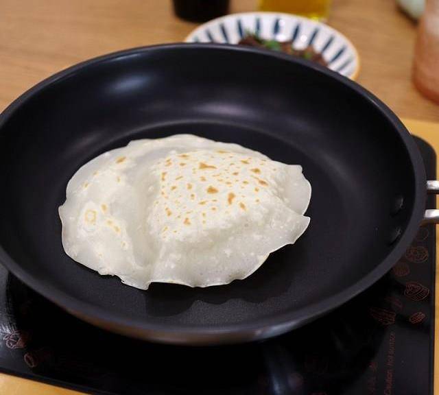 第11步、想要餅皮再筋道些,多花一分鐘繼續烙,面糊軟餅居然也能鼓起大泡,形成小分層。