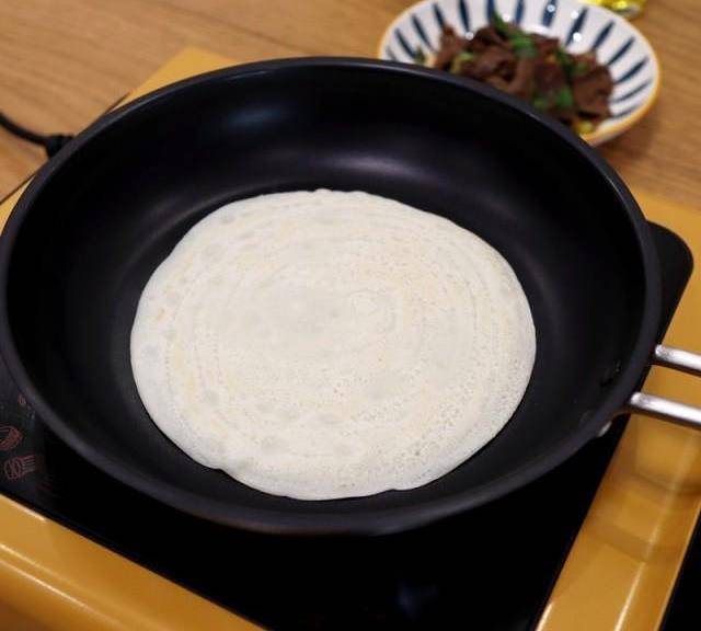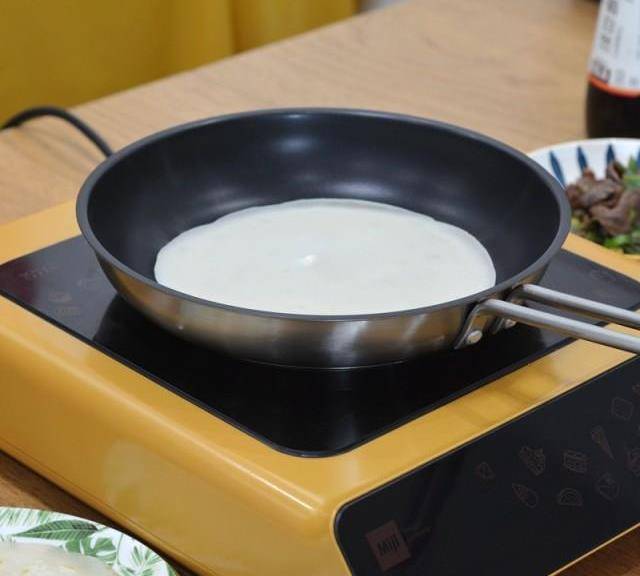 第8步、鍋用廚房紙擦凈,微微加熱,無需一滴油,將適量面糊倒入鍋中,端起鍋,使面糊均勻佈滿鍋底,重新放在爐上加熱。