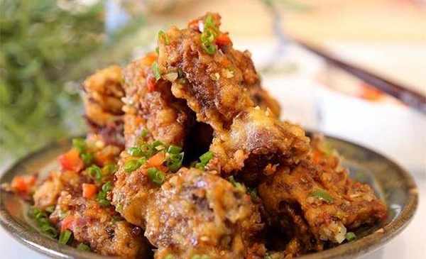 7、加入排骨,加入適量椒鹽,翻炒均勻即可。