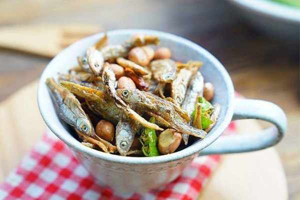 毛魚幹200克、花生米300克、辣椒3個、玉米油1茶匙、細鹽適量、椒鹽適量。