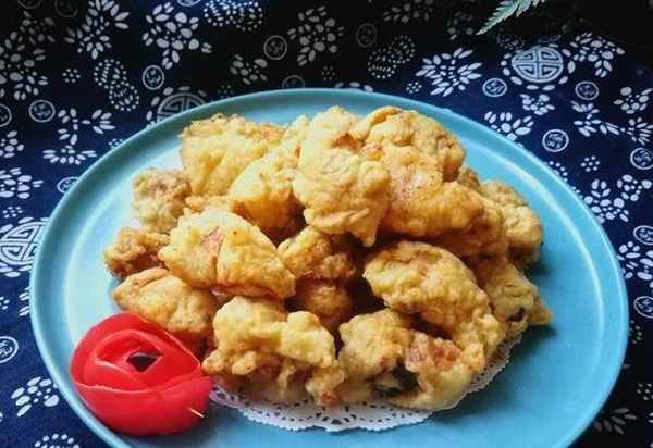 4、適量清水,一點食用油,攪成稠面糊,醃好的雞塊放入,均勻裹上面糊。