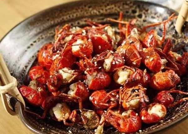 4、將炸好的小龍蝦撈出來瀝幹油分;