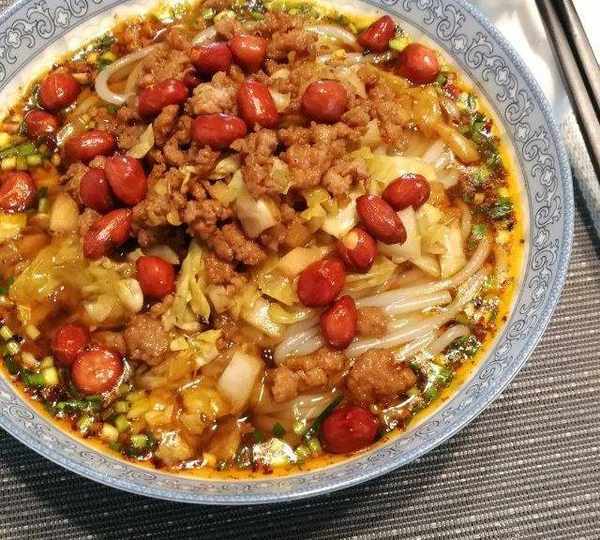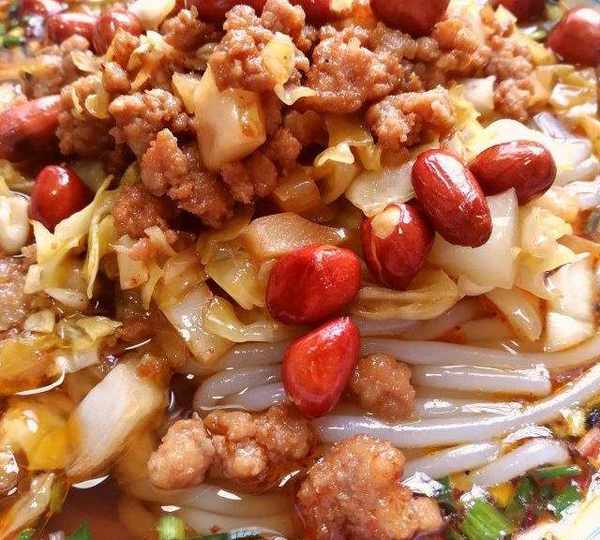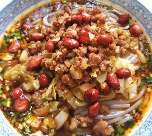 原料:米粉、肉末、泡菜、花生、豬油、香蔥末、花椒面、油辣子、味精、生抽、香醋。