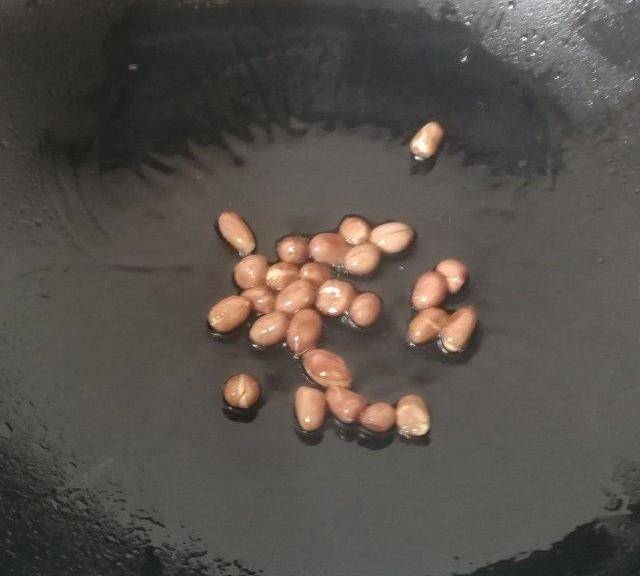 第2步、炒幾顆花生米備用。另一邊爐灶燒開水。