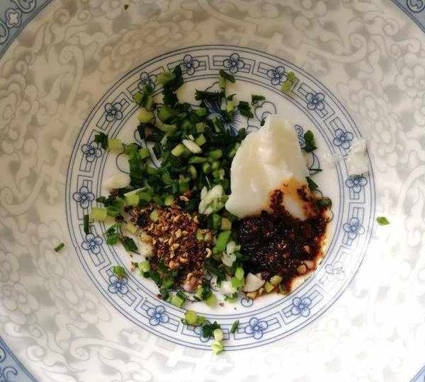 第5步、碗裡加入香蔥末、花椒面、豬油、油辣子、味精等調料。
