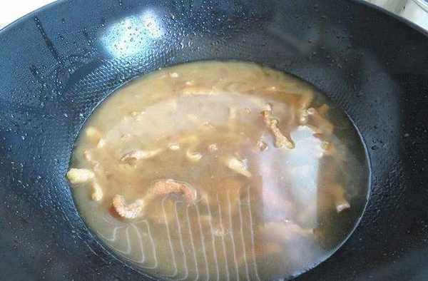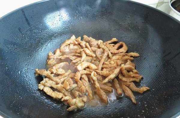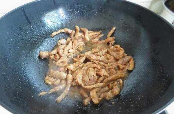 4、鍋中加油燒熱後倒入肉絲翻炒至變色