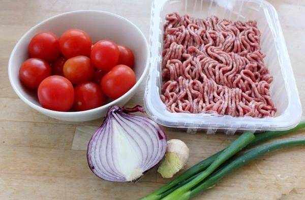 備好材料:聖女果、牛肉泥、洋蔥、蔥和薑