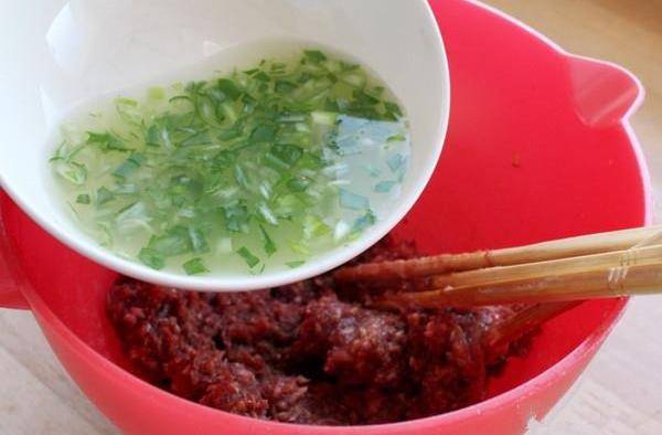 3.將10克薑和15克蔥切碎加水(約80ml)分多次拌入肉泥餡中,攪拌上勁。