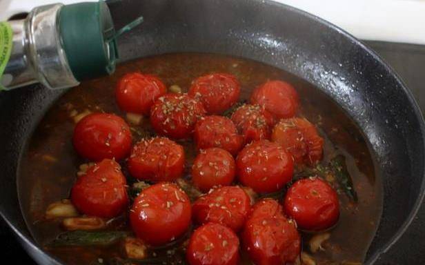 8.另起一油鍋,油熱,先下蔥和蒜,再下聖女果翻炒至軟出汁。