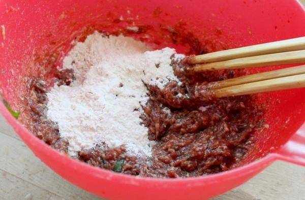 2.牛肉泥內加入老抽5克、生抽15克、糖4克、鹽2克 、米酒2湯匙、雞蛋1個、適量的黑胡椒粉和十三香拌均