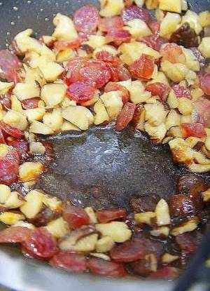 繼續翻炒至臘腸的油開始溢出,加入生抽,也可以加一點糖來調味