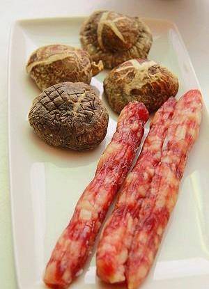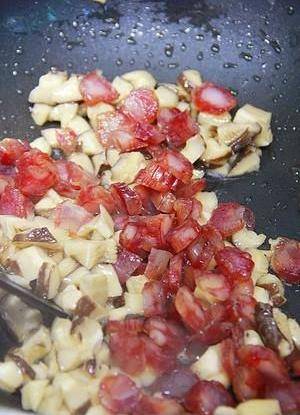 幹香菇用溫水泡發至心變軟,然後和臘腸一起切成小粒備用