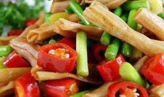 材料:煮熟的肥腸200克 黃喉150克 土豆粉條100克 香菇80克 鮮青尖椒80克 青紅辣椒節30克 薑末、蒜末、鹽、味精、藤椒油、香油、色拉油各適量