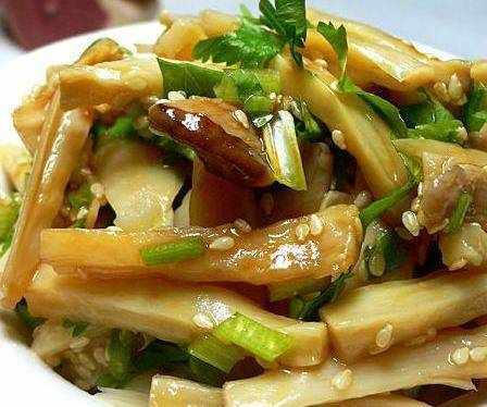 材料:杏鮑菇2隻,香菜2根,熟芝麻(白色) 30克;鹽;初榨橄欖油;生抽;