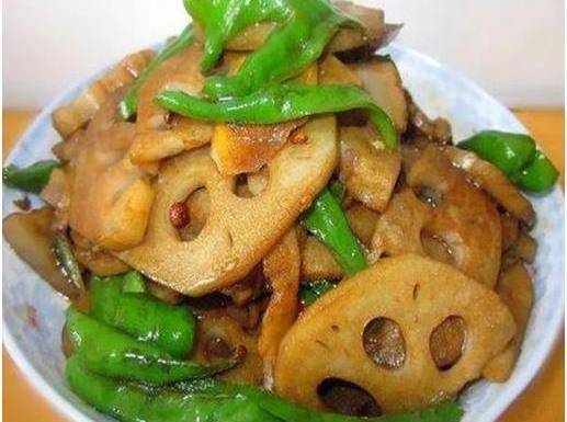 材料:藕片500g 青椒50g 油適量 鹽適量 花椒適量 青椒適量 薑片適量 糖適量 味精適量 醋適量 醬油適量