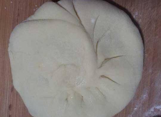 7、包好餡,用手輕柔的均勻用力壓成餅,這時皮的厚度和餃子皮差不多,這樣餡餅熟的快;