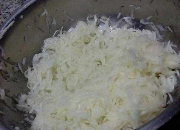 3、白蘿卜去葉切尾,洗幹凈分兩段,用右邊這個細的擦絲,然後蘿卜絲撒鹽搓均勻醃出水,鹽也不要撒太多,可以撒4食勺左右的鹽;