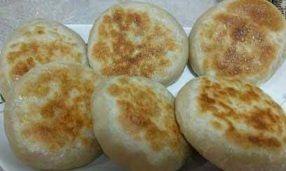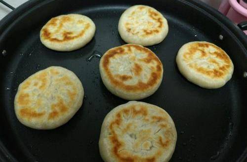 8、大勺裡多放些食用油,稍熱放餅,小心別燙著,待餡餅微黃翻身,餡餅中間鼓起,餡餅就熟啦!烙餅用中火,你也可以用電餅鐺。