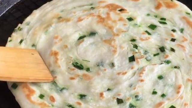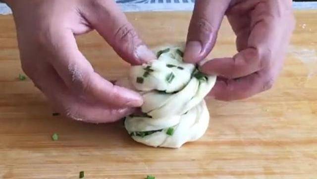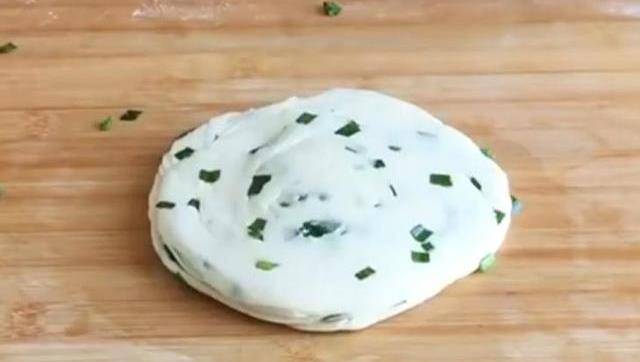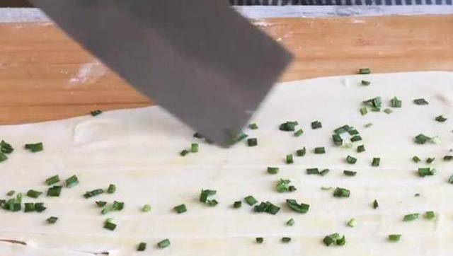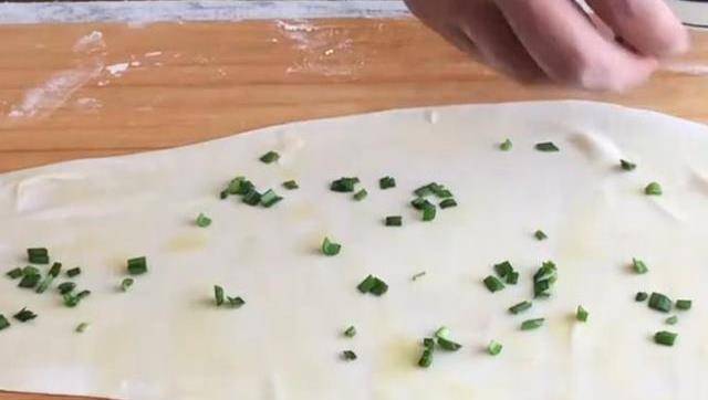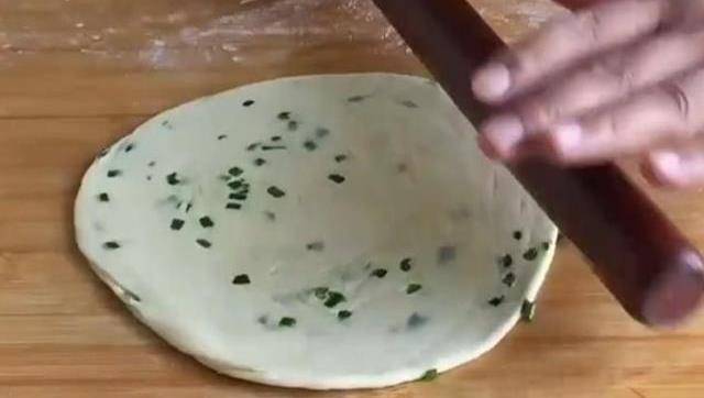 用手在手心裡來回揉圓,再按壓扁成5公分左右的圓餅。再用搟面杖幹成張輕薄面皮。在上面塗上油,撒上蔥花。