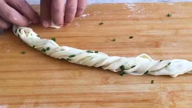 然後給面皮卷成長條狀,像根粗辮子一樣。再從面條一段慢慢給卷起來。