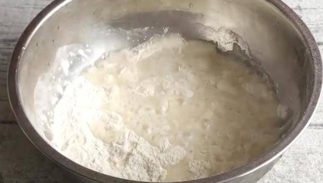在倒入一半面粉,加入適量鹽,增加口感筋道。加入涼水攪拌成面泥狀。