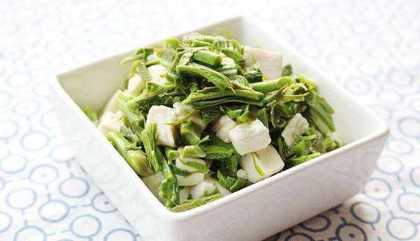 6. 香椿碎和豆腐放大碗裡,加適量的鹽,淋上適量的橄欖油翻拌均勻即可