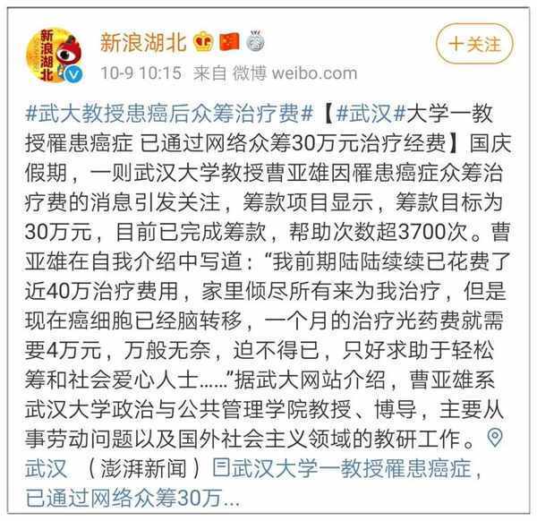 去年,武漢大學有一名教授在一個網絡平臺發起了眾籌。這名教授稱自己因癌細胞腦轉移,需要30萬左右的治療費,因為自己已經無力承擔,所以不得不求助愛心人士和組織。