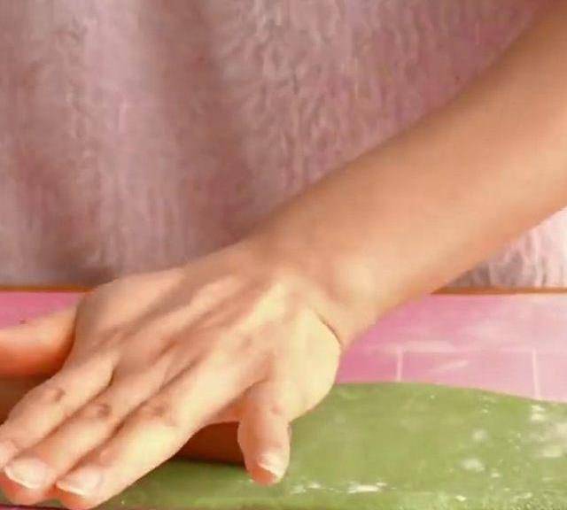 第10步、綠色面片上刷一點清水,把白色的面條放上去,慢慢的卷起來。