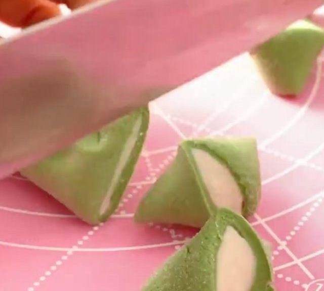 第9步、再把綠色的面團同樣切開,然後和搓成長條狀,再搟成薄片,盡量厚薄均勻,寬度也相同。