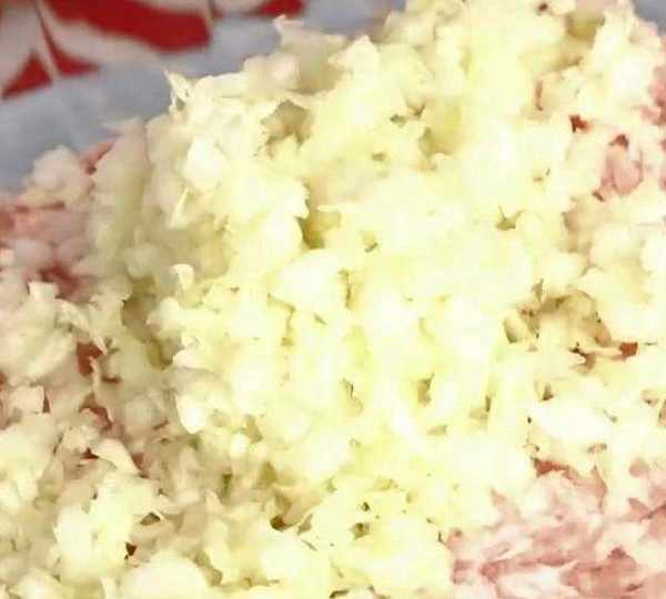 第1步、把白菜切成碎末,然後倒入肉末碗中,先不要急於調餡,白菜遇到鹽以後會出水。