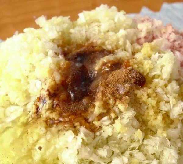 第6步、調餡。白菜肉末餡中倒入蔥薑末、老抽、生抽、蠔油、五香粉、食鹽、香油,磕入一個雞蛋。
