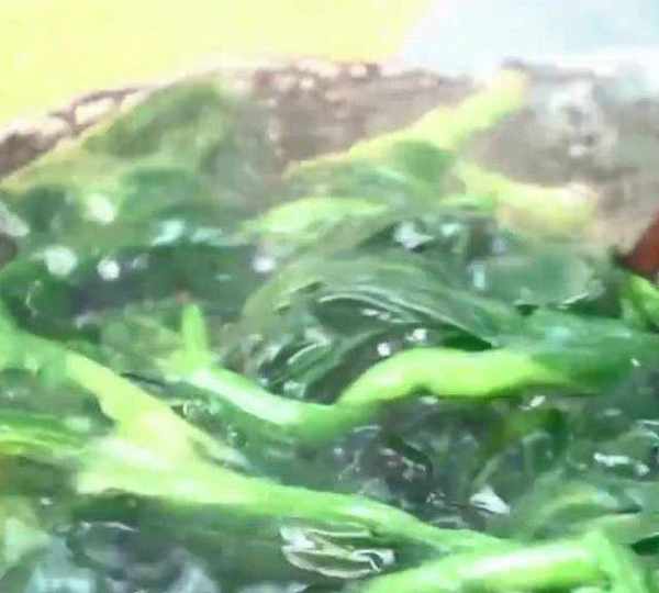 第2步、把菠菜放入開水中焯水兩分鐘左右,焯軟以後就可以撈出來瞭。