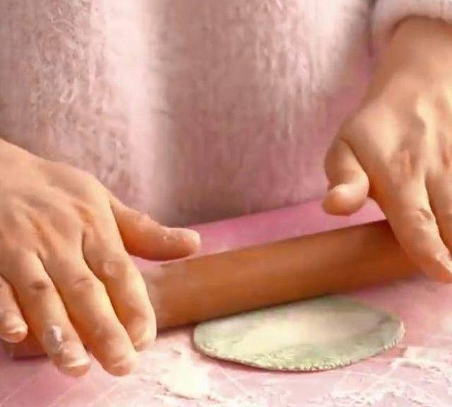 第12步、將餃子劑子按平,盡量均勻一些,然後搟成餃子皮。