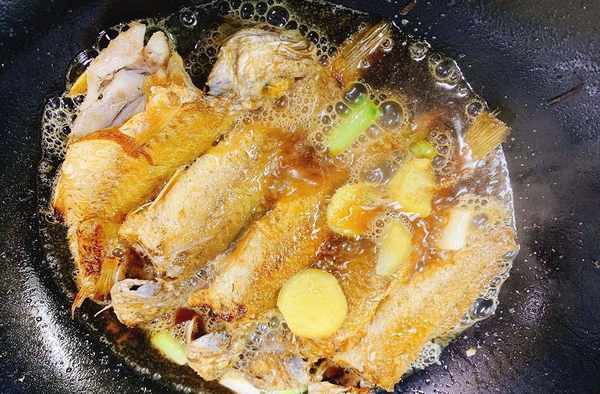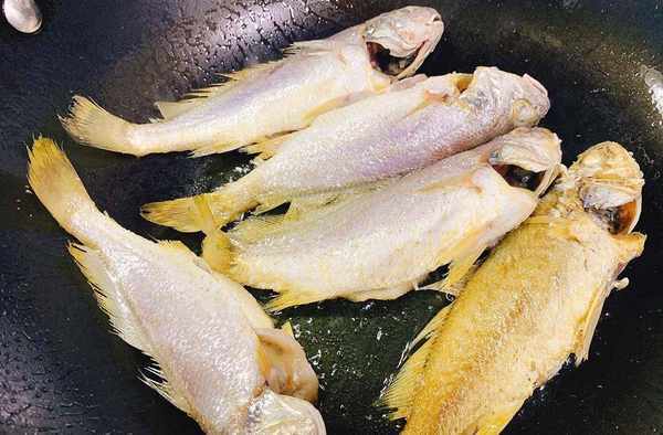 2、很多人可能在煎魚的時候會裹蛋液,或者淀粉面粉等防止粘鍋,千萬不要這麼做,這樣就多瞭一層粉,紅燒出來之後很影響鮮嫩的小黃魚口感,其實隻需要在煎魚的時候等鍋燒熱,然後在下入油,油也燒熱,才能放魚,這樣煎的魚才能不粘鍋不破皮,當然放魚前在下幾粒鹽這樣還能防止油濺鍋燙到,更不會粘鍋,有的人如果還是不放心,那就在鍋底在擦一遍生薑後再下油,這樣肯定不會粘鍋。