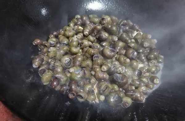 4.當大蒜和薑絲的香味從鍋中飄出後,便到瞭最激動人心的時刻——下田螺。田螺下鍋翻炒,火要提旺一點,這樣田螺肉才會縮回去,一會兒出鍋的田螺口感才會有嚼勁。