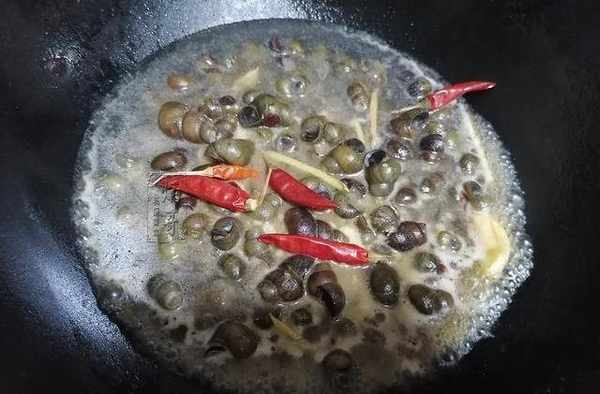 5.待翻炒的差不多後,我們還需要將一些開水加入鍋中,水隻需要微微漫過田螺即可,之後再依次加入我們的生薑辣椒等調味品等待收汁。