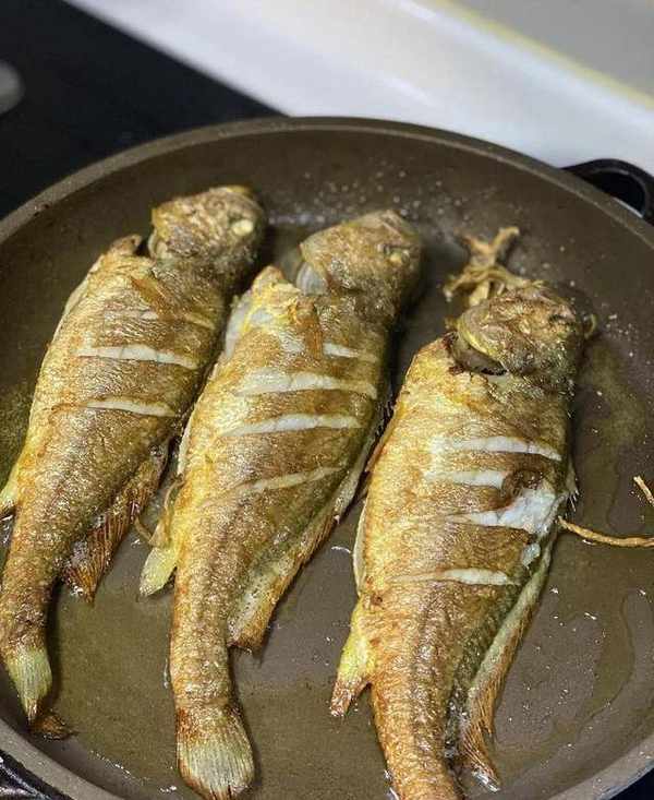 5.加入黃魚小火慢煎,煎至兩面金黃酥脆。一定要煎透煎熟哦