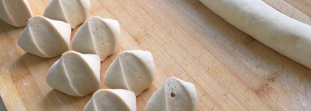 7.把發酵好的面團取出,放在案板上,稍微的揉一下後,搓成長條,切成大小相等的劑子,撒上少許幹粉防止粘連,用手按壓扁,記得蓋上保鮮膜防止風幹喲!
