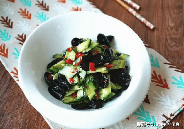 最後將黃瓜、木耳、料汁放在一起,攪拌均勻裝盤。喜歡吃香菜,可以加點一些拌。