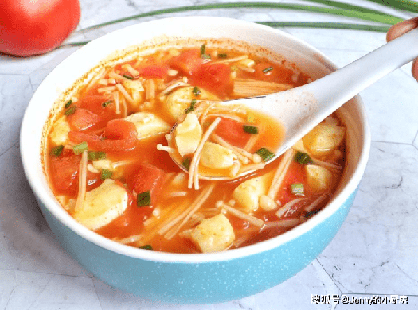 金針菇去掉根部,清洗幹凈。豆腐沖洗一下,切成小塊。