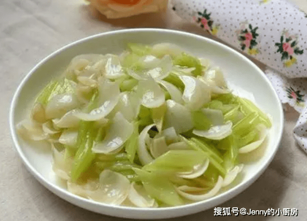 另起鍋加油,燒熱後倒入西芹百合翻炒,再倒入鹽翻炒均勻。