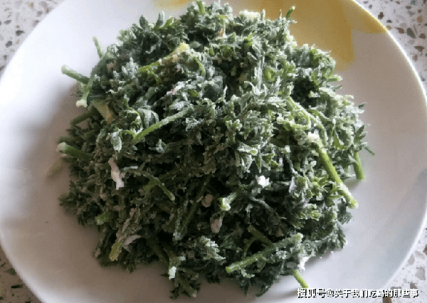 1、新鮮胡蘿卜纓洗幹凈,瀝幹水分,表面沒有水滴後切成長段,放入大盆裡加入一勺面粉攪拌均勻,讓每根胡蘿卜纓都裹上一層幹粉。