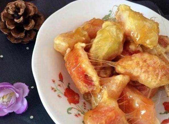 (3)鍋內加水和白糖,炒至金黃色能拔出絲時,倒入炸好的香蕉,顛幾個過,撒上青紅絲,糖漿掛勻時出勺即成。