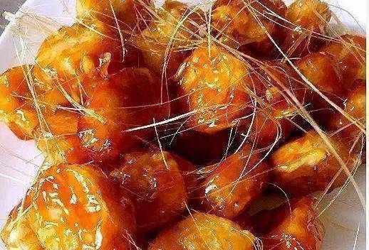 (4)鍋內放油、水和白糖炒成淺黃色能拔出絲時倒入炸好的西瓜條,將鍋端離火口,邊顛勺邊加入青紅絲和芝麻,糖漿掛勻時盛在抹油的盤內即可。