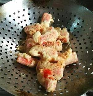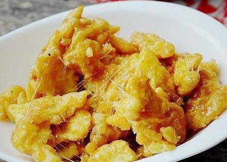 (3)炒鍋裡再放入熟豬油,用旺火燒至七八成熱時,改用小火,將雞蛋塊逐塊蘸滿蛋糊,放入油鍋內炸到蛋糊凝固撈出,再用旺火把油溫回升到八成熱,把蛋塊回鍋復炸至外層硬脆,倒入漏勺瀝油。
