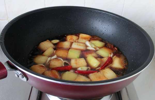 5.調入甜面醬、生抽、大料、幹辣椒、鹽、蔥、薑,燒開。