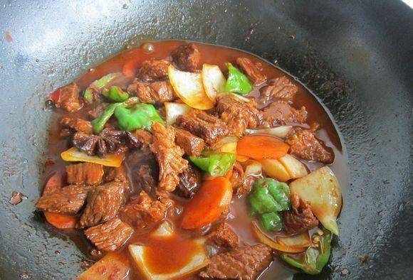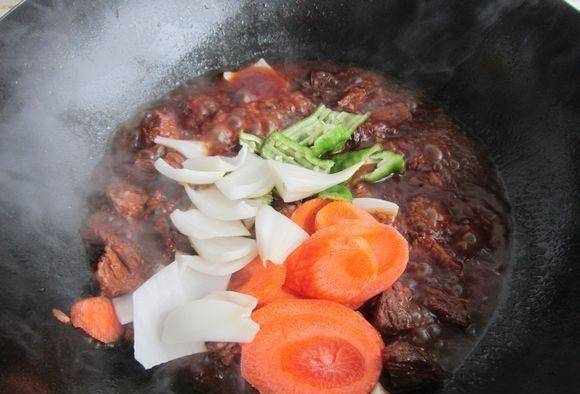 10.煮至牛肉熟透,加入胡蘿卜片、洋蔥片、青椒片